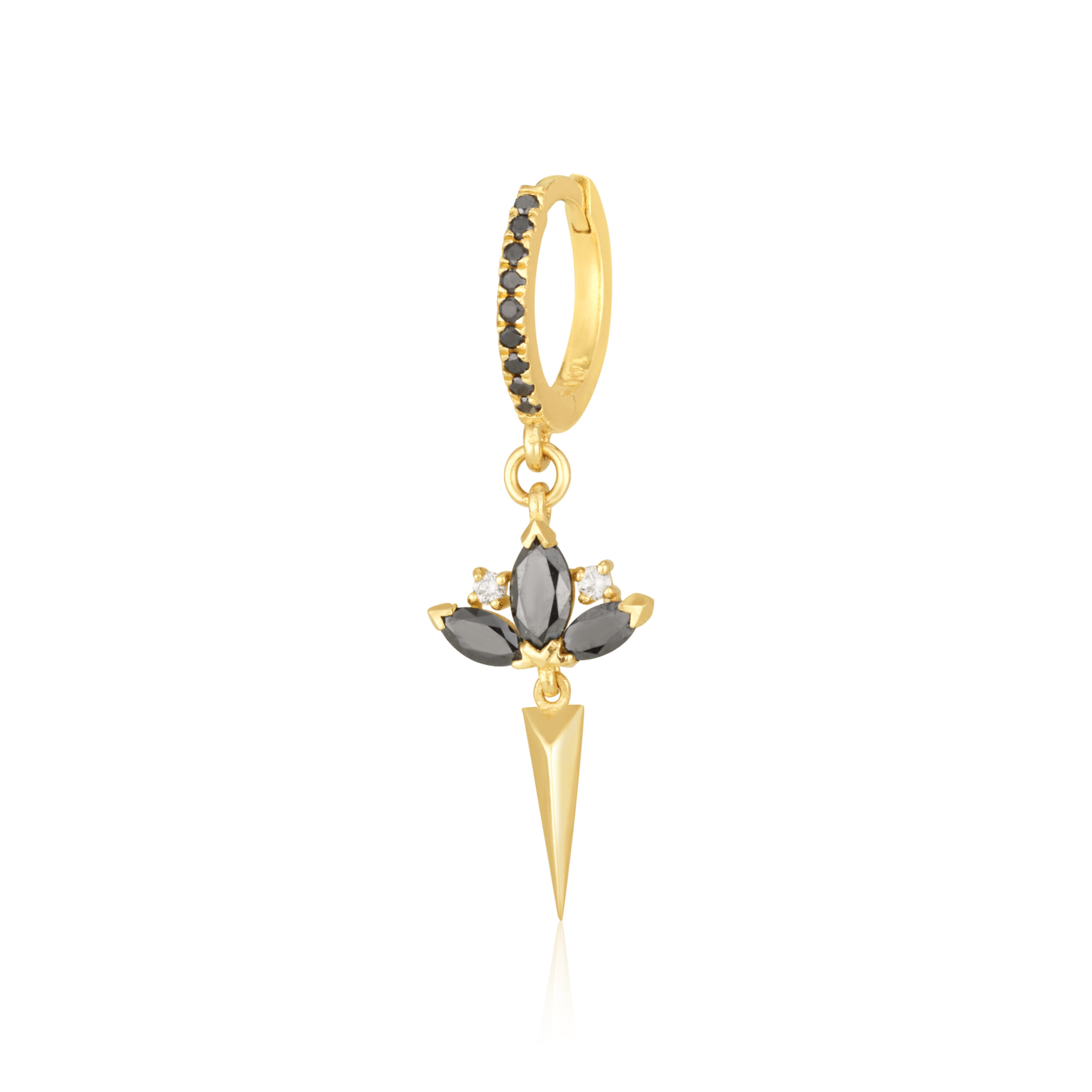 A pave of elegant black diamonds line this hoops’ outer layer, while dangling our sensational adorned lotus emblem in black diamonds. Adorned below can be found Malkas luxurious geometric gold spike. This elegant earring may be worn as an everyday look or during a night out.