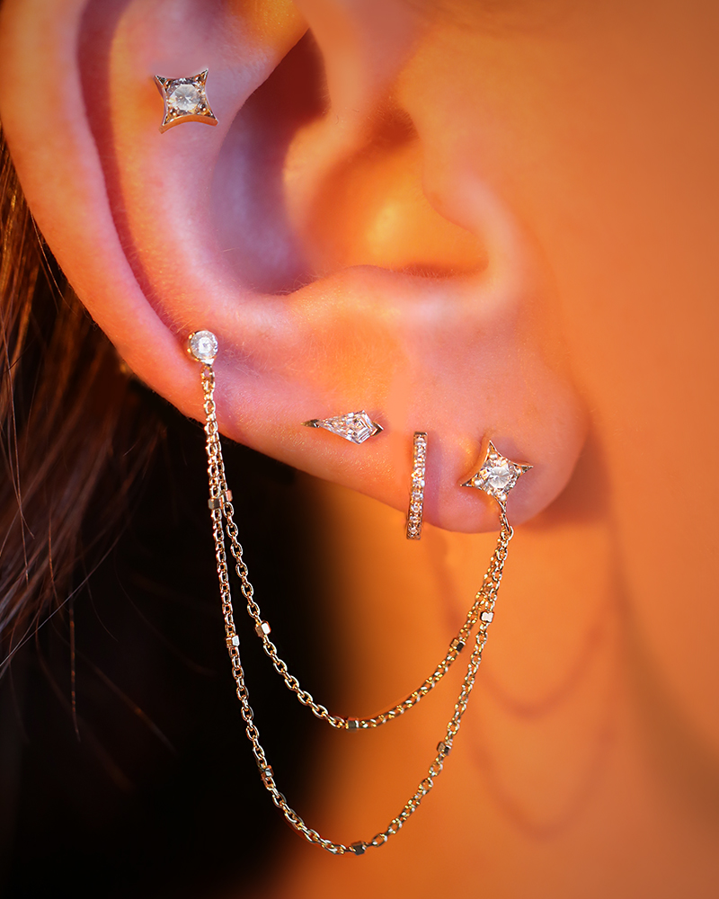 Two hole Noa & Solitaire Earring is unique and elegant design. Our breathtaking Noa Stud emblem is perfectly held into one hole, draped by two delicate gold chains, into the next hole by a perfect solitaire diamond. A captivating creation.
